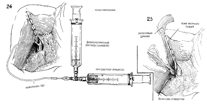 Если условия позволяют, следует сделать операционную холангиограмму, чтобы убедиться в полном очищении проточной системы (Рис. 24). Когда запланирована эта процедура, то пузырный проток не лигируют, пока не удален желчный пузырь и не сближено ложе печени. Нужно изначально оставить лишнюю длину пузырного протока, чтобы упростить эту процедуру. Маленьким москитными зажимами захватывают конец разделенного пузырного протока, пока снимают прямоугольный зажим. Поскольку клапаны Хейстера обычно мешают введению небольшой полиэтиленовой трубки в пузырный проток, этот канал нужно очистить введением небольшого металлического зонда. Шприц с физраствором, а также разбавленное контрастное средство следует соединить двусторонним адаптером в закрытую систему, чтобы воздух не попадал в протоки. Полиэтиленовая трубка размером 190 заполняется физраствором по мере того, как ее вводят на короткое расстояние в общий проток. Трубку закрепляют в пузырном протоке одним швом, завязанным на хирургический узел. Убирают все марлевые тампоны, зажимы и ретракторов, и анестезист возвращает стол в горизонтальное положение. Вводят 5 мл контрастного состава концентрации 20 – 25% и делают рентгеновский снимок. Ограниченные количества разбавленного раствора не допускают облитерации маленьких камней внутри протоков. Делают вторую инъекцию 15 – 20 мл, чтобы полностью разметить проточную систему и обеспечить проходимость фатерова соска. Трубку нужно сместить латерально, а двенадцатиперстную кишку осторожно сдвинуть вправо, чтобы получить четкую рентгенограмму без скелетной системы или трубки с контрастным средством. Если отмечены сомнительные тени, делают две рентгенограммы для сравнения. Если есть отросток, его удаляют в течение перерыва, необходимого для проявления рентгенограммы. Если не предусмотрено никаких других исследований, трубку вынимыот, а пузырный проток лигируют около общего протока.