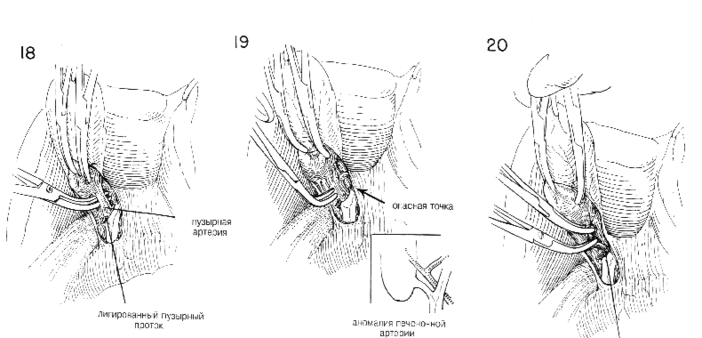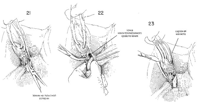 После того, как будут перевязаны пузырный проток и пузырная артерия, начинают удаление желчного пузыря. Разрез, первоначально сделанный на нижней поверхности желчного пузыря на расстоянии при мерно 1 см от края печени, продлевают вверх вокруг дна (Рис. 23). Можно легко выявить плоскость отечного расщепления посредством введении нескольких миллилитров физраствора между серозным и серозно-мышечным слоем, используя эту плоскость расщепления для раз деления. Важно отделить серозный слой скальпелем или ножницами вдоль боковых и медиальных краев желчного пузыря, чтобы не отрывать желчный пузырь от печеночных тканей вытягиванием. Если это про изойдет, обнажится чувствительная поверхность печени, что может при вести к невозможности перитонеализировать ложе печени. Хирург левой рукой держит зажим, наложенный на желчный пузырь, и ножницами осторожно разрезает свободную ареолярную ткань между желчным пузырем и печенью. Это позволяет отделить желчный пузырь от его ложа, не разрезая больших сосудов. Прежде, чем дно желчного пузыря будет окончательно удалено из его гнезда в печени, можно воспользоваться его вытяжением для ТОГО, чтобы край печени сохранялся в вывернутом положении, что способствует обнажению более глубоких частей поля. Чтобы закрыть открытое ложе желчного пузыря на нижней поверхности печени, накладывают узловые швы из тонкого шелка 0000 (Рис. 25). Эти швы завязывают снизу вверх по мере того, как желчный пузырь перестают натягивать, отделяя его от печени. Разрезают последнее перитонеальное присоединение меду желчным пузырем и печенью.