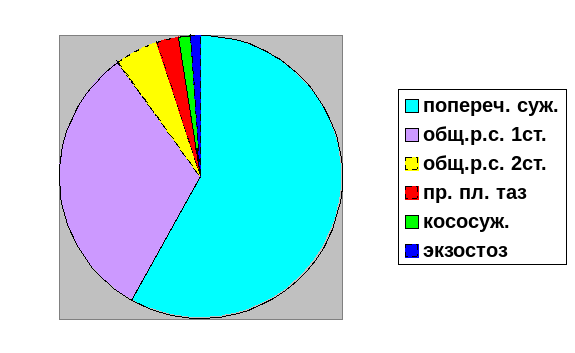 По классификации анатомически узкого таза на 1-м месте находится поперечносуженный таз – 58%, что совпадает с литературными данными – 45,2%. На 2-м месте по данным нашего анализа располагается общеравномерносуженный таз – 37%, по данным литературы – 8,5%. На 3-м месте по частоте встречаемости занимает по нашим данным простой плоский таз – 2,47%, по литературным данным – 13,6%.
