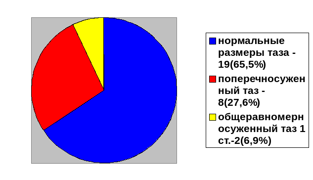 Из 29 (3%) родов клинически узкий таз возник в 19 (65,5%) – с нормальными размерами таза, в 10 (34,5%) случаях при анатомическом сужении таза (8(27,6%) женщин с поперечносуженным тазом и 2(6,9%)женщины с общеравномерносуженным тазом 1 степени сужения)