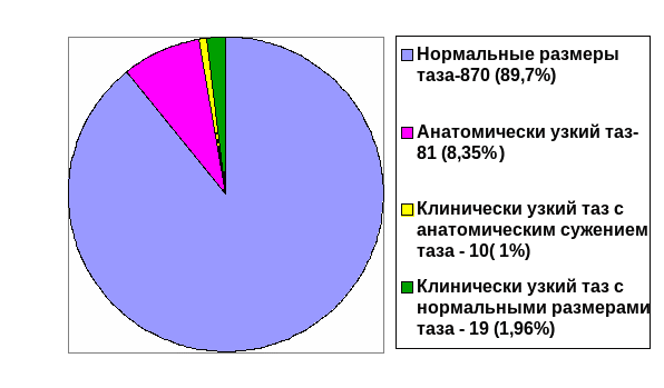 Частота встречаемости анатомически узкого таза по данным нашего анализа – 8,35 %, по литературным данным – от 1,04 до 7,7 % (Калганова Р.И., Чернуха Е.А., 1991г.). Частота встречаемости клинически узкого таза с анатомическим сужением таза – 1%, по литературным данным – 25 – 30 %. Частота встречаемости клинически узкого таза с нормальными размерами таза составила 1,96 %, по литературным данным – 0,3 %.