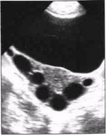 . Многокамерный вариант. Локализация такая же, как и при первом варианте, но с большим распространением в латеральном и медиальном направлениях за счёт более крупных размеров патологического очага и часто встречающегося двухстороннего поражения. На эхограммах (условия сканирования прежние, с элементами продольной эхолокации) в одной из параметральных областей с распространением в позадиматочное пространство лоцируется многокамерное жидкостное образование неправильной вытянутой формы, которая зависит от числа камер и степени распространенности процесса. Многокамерность образования обусловлена множественными перетяжками, возникающими либо вследствие перегибов маточной трубы, заполненной воспалительным экссудатом, либо за счет спаек, частично или полностью перекрывающих просвет трубы. Число камер (полостей) колеблется от 2 до 7. Стенки тонкие, контуры чёткие и неровные из-за выпячивания перерастянутых жидкостью стенок маточной трубы. Размеры варьируют в широких пределах, но во всех случаях длина гидросальпингса значительно больше его поперечника. В некоторых наблюдениях длина жидкостного образования достигает 150 мм. Структура содержимого однородная. Крайне редко в одной из полостей видны мелкие эхопозитивные включения линейной формы, низкой эхоплотности (фибрин, детрит), хорошо видимые при ТВ-сканировании. В отличие от других патологических многополостных жидкостных образований встречающихся в малом тазу, для многокамерного гидросальпингса характерно своеобразное расположение составляющих его камер - друг за другом, как звенья цепи. Этот симптом не может считаться патогномоничным, но безусловно является постоянным эхо-признаком данного вида экссудативного сальпингита. Матка не изменена. Яичник на стороне поражения не лоцируется, так как параметральная область и позадиматочное пространство, как правило, полностью заняты патологическим жидкостным объектом. Другой яичник без особенностей.Содержимое одной или нескольких полостей может быть неоднородным из-за множественных эхопозитивных включений, обычно скапливающихся у нижней стенки образования. Эти включения имеют линейный, точечный или нитевидный характер; морфологически - детрит и фибрин. Стенки такой полости (полостей) в 80% диффузно утолщены (до 6 мм) вследствие воспалительной инфильтрации и отёка. Указанная картина бывает при гнойном сальпингите, который, в случае многокамерного варианта гидросальпингса, является осложнением обычного экссудативного воспалительного процесса.