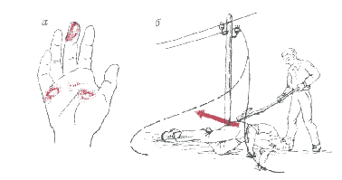 освободить пострадавшего от воздействия тока, при возможности выключить ток в сети. Если это не удается сделать, то с помощью подручных средств добиться удаления пострадавшего от токонесущих предметов или же отбросить от него провода (рис.б).