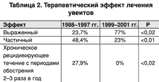 Среди пациентов (190 человек), прошедших лечение в ООБ с 1988 по 1997 год, выраженный терапевтический эффект наблюдали у 45 больных (23,7%), т.е. удавалось добиться полного исчезновения клинических признаков воспаления, значительного рассасывания помутнения в стекловидном теле, повышения остроты зрения до визуса, предшествующего заболеванию. Повторных обращений для стационарного лечения среди этих пациентов не было. У 92 больных (48,4%) эффект был частичным, удавалось добиться значительного, но не полного уменьшения воспалительных явлений, повышения остроты зрения, но не более чем на 70% от исходного визуса. 64 из них повторно лечились в ООБ. У 53 пациентов (27,9%) увеит носил характер хронического рецидивирующего процесса с периодами обострения 2–3 раза в год (у 18 из них исходом повторных обострении явились фиброз стекловидного тела и отслойка сетчатки, у 23 сформировалась осложненная катаракта).
