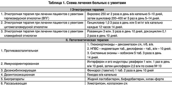Для лечения больных использовали поэтапный подход. При поступлении пациента в стационар назначали препараты патогенетической терапии – глюкокортикоиды (дексаметазон с/к, в/в), нестероидные противовоспалительные препараты (диклофенак, индометацин), дезинтоксикационные (гемодез в/в, энтеродез per os), десенсибилизирующие (фенкарол, тавегил) средства. После установления этиологического фактора воспаления к лечению присоединяли специфические противовирусные и (или) противохламидийные препараты. Этиотропная терапия при лечении пациентов с увеитами герпесвирусной этиологии включала виролекс 250 мг 2 раза в день в/в капельно 5–10 дней, затем ацикловир 200–400 мг 5 раз в день 5–14 дней; при лечении пациентов с цитомегаловирусными увеитами использовали ганцикловир 1,0 г 3 раза в день или 5 мг/кг в/в капельно каждые 12 часов 14 дней; у пациентов с хламидийными увеитами использовали спирамицин (ровамицин) 3 млн. 3 раза в день 10 дней, доксициклин 0,2 г, затем 0,1 г 2 раза в день 10 дней.