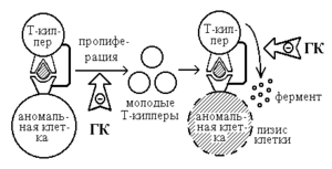 Цитотоксические Т-лимфоциты также играют важнейшую роль в реализации клеточных иммунных реакций. Различные субпопуляции этих клеток осуществляют антителозависимый, не требующий присутствия комплимента лизис клеток-мишеней, то есть разрушение аутологичных, аллогенных или ксеногенных клеток в присутствии специфических против этих клеток антител или независимый от антител и комплимента лизис любых опухолевых клеток-мишеней аллогенной, ксеногенной или аутологической природы. ГК способны существенно тормозить функции всех субпопуляций этих лимфоцитов. Cуммарная схема ингибирования глюкокортикоидами передачи иммунного сигнала между лимфоидными клетками представлена на рис.3.