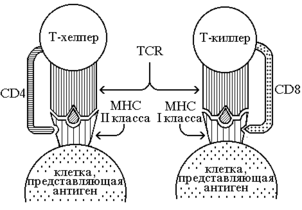 Т-киллеры - наиболее агрессивные клетки этого звена. Они выискивают в других клетках признаки вирусной инфекции и иных аномалий (злокачественная трансформация). При встрече предшественника Т-киллера с антигенным комплексом (антиген, связанный с молекулой главного комплекса гистосовместимости (МНС)) на поверхности зараженной клетки прекиллер претерпевает многократное деление. Дочерние клетки несут рецепторы для этого антигена, становятся активными киллерами и разрушают клетки, зараженные этим вирусом, тем самым делая его уязвимым для антител, связывающих вирусные частицы (Фон Бёмер Х., Кисилов П., 1991). Распознавание антигена Т-киллерами специфично в отношении и антигенного пептида и молекул МНС. Специфичность, заключающаяся в двойном распознавании, обусловлена Т-клеточными рецепторами (TCR). Для полной активации прекиллера недостаточно связывания ТСR с антигенным комплексом. Необходимо связывание еще одной молекулы - CD8-корецептора. Этот белок одинаков у всех киллеров, но связывается в участке, отличном от TCR. СD8 - маркер Т-киллеров. Этот белок принимает участие в распознавании антигена киллерными клетками. Активация Т-киллера наиболее эффективна, когда TCR и CD8 связываются с одной и той же молекулой. Т-хелперные клетки тоже имеют TCR и инвариантный корецептор, которые совместно обеспечивают активацию Т-хелперов. Но в данном случае корецептор другой - CD4 (рис.2). ТСR и CD8 киллерных клеток связываются с молекулой МНС I класса и пептидами из белков, синтезирующихся в самой клетке. TCR и CD4 хелперов связываются с белками МНС II класса и антигенными пептидами из белков, поглощенных клеткой (Daynes R.A. et al., 1995). Т-хелперы отличаются по своей роли в иммунном ответе: они кооперируют с В-клетками в антительном ответе на такие антигены, как бактериальные токсины. Токсичный белок, попадающий в кровь, захватывается макрофагом. В-лимфоциты тоже поглощают молекулы токсинов, связавшиеся со специфичными рецепторами типа антител на их поверхности. Внутри макрофагов и В-лимфоцитов токсин расщепляется, а образующиеся пептиды презентируются на поверхность клетки белками МНС II класса. Как только ТСR и СD4 свяжутся с одной и той же молекулой МНС класса II на поверхности клетки, Т-лимфоциты начинают делиться, образуя активные хелперы (макрофаги максимально способны активировать эти клетки). Активные Т-хелперы секретируют интерлейкины (IL), которые стимулируют В-лимфоциты к делению и секреции больших количеств антител. Свободные антитела связывают токсин и нейтрализуют его.