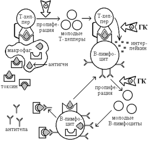 Основным физиологическим регулятором взаимодействия клеток во время формирования иммцнного ответа являются гормоны надпочечников - глюкокортикоиды (ГК). Ранние этапы развития иммунологических реакций, важнейшее звено которых - пролиферация клеток, являются наиболее чувствительными к действию ГК (рис.3). Важной стороной действия фармакологических доз ГК гормонов, во многом определяющей их тормозящее влияние на гуморальный и клеточный иммунный ответ, является способность гормонов угнетать процессы деления иммуннокомпетентных клеток. Установлено, что наиболее чувствительными к действию гормонов являются начальные фазы процесса пролиферации. Эффекты действия ГК на процессы деления клеток во многом зависят от способности этих гормонов подавлять продукцию интерлейкина-1 и интерлейкина-2, играющих ключевую роль в реализации пролиферативных реакций. Кроме интерлейкинов, ГК гормоны ингибируют продукцию и других гуморальных факторов, вырабатываемых активированными клетками иммунной системы.