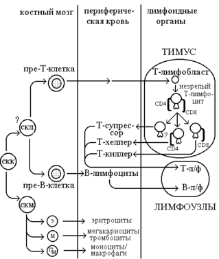 Лимфоциты, как и все остальные элементы крови, образуются из популяции изначальных гематолимфоидных предшественников, так называемой стволовой кроветворной клетки (СКК). Дифференцировка СКК в Т- и В-клетки лимфоидного ряда начинается после ее попадания в особое индуцирующее дифференцировку микроокружение, имеющееся в таких органах, как костный мозг и тимус. Гипотетическая схема дифференцировки СКК и образования различных подклассов Т-лимфоцитов представлена на рис.1. Полипотентная СКК характеризуется тем, что одна из дочерних клеток, образовавшихся в результате ее деления, дифференцируется, а другая остается недифференцированной и служит источником образования последующих поколений дифференцированных клеток. СКК в результате такого деления может превратиться в самообновляющуюся клетку-предшественник с более ограниченными возможностями. Так, коммитированная стволовая лимфоцитарная клетка (СКЛ) дает начало пре-Т- и пре-В-клеткам. Более дифференцированная миелоидная стволовая клетка (СКМ) служит непосредственным предшественником других клеток крови (эритроциты, гранулоциты, мегакариоциты, тромбоциты и моноциты/макрофаги).