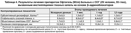 Результаты клинического обследования пациентов представлены в таблице 1. Из таблицы видно, что частота и выраженность клинических признаков ССГ у больных, систематически получающих глазные капли на основе -адреноблокаторов, существенно превышают таковые у больных из контрольной группы (0,05 Наиболее частыми симптомами ССГ явились уменьшение или отсутствие слезных менисков, складка бульбарной конъюнктивы, локализующаяся над свободным краем нижнего века, ощущение «инородного тела» в конъюнктивальной полости, дегенерация эпителиальных клеток конъюнктивы, диагностированная по результатам биомикроскопии с использованием 1% раствора бенгальского–розового. Диагностически значимыми признаками ССГ у обследованных явились также ощущения «жжения» и «сухости» в глазах, усиливающиеся при воздействии на глаз кондиционированного воздуха, ветра, дыма (в том числе от сигарет), а также конвекции воздуха от тепловентиляторов. Рассматриваемые клинические признаки оказались сходными с данными клинического обследования больных с ССГ различной этиологии (в том числе на фоне системных заболеваний), описанными различными авторами [1, 11, 12]. Данные, полученные при исследовании слезопродукции и стабильности слезной пленки у всех обследованных, приведены в таблице 3. Установлено, что все исследованные параметры у пациентов, получающих инстилляции 0,5% тимоптика, имели заметные отличия от соответствующих величин, определенных при обследовании контрольной группы. Так, показатели стабильности слезной пленки в анализируемой группе больных имели достоверно более низкие значения, чем у людей соответствующего возраста, не применявших глазные капли на основе -адреноблокаторов. Аналогичная закономерность прослеживались в результатах исследования слезопродукции. При этом значительно большие нарушения стабильности слезной пленки, а также всех исследованных параметров слезопродукции зафиксированы у женщин с развившимся к моменту обследования климактерическим синдромом (в фазе постменопаузы). Таким образом, в патогенезе ССГ, развивающегося на фоне систематических инстилляций в конъюнктивальную полость глазных капель на основе -адреноблокаторов, основное значение имеет снижение основной и рефлекторной секреции слезной жидкости, сопровождающееся нарушением стабильности прекорнеальной слезной пленки. Безусловно, следует также иметь в виду возможность развития у таких больных ССГ климактерического (у женщин) или другого (синдром Съегрена и т.п.) генеза, имеющего значение в соответствующем возрасте. В целях оценки возможностей медикаментозной компенсации ССГ, развивающегося на почве инстилляций -адреноблокаторов, нами проанализированы долговременные результаты лечения 29 таких больных (55 глаз). Всем пациентам в конъюнктивальную полость больного глаза инстиллировали гелевый препарат Офтагель (Santen, Финляндия) с периодичностью 2–3 раза в сутки. В последующем частоту инстилляций препарата определяли, ориентируясь прежде всего на субъективные ощущения больного и динамику стабильности слезной пленки. Результаты проводимой терапии, оцененные на 30–й день, после первого года и после полутора лет лечения, представлены в табл. 4. Из таблицы видно, что уже в течение первого месяца лечения достоверно уменьшается выраженность субъективного