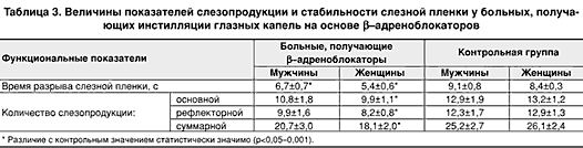 Известно, что постоянные инстилляции -адреноблокаторов имеют следствием снижение основной и рефлекторной слезопродукции, достигающее 28–36% от ее исходного уровня [3, 4, 6]. В результате снижения секреции слезной жидкости нарушается стабильность слезной пленки и развиваются клинические симптомы ССГ [3, 4, 6, 9, 10]. Безусловно, явления ССГ у больных с первичной открытоугольной глаукомой могут быть частично связаны с закономерным снижением слезопродукции в пожилом возрасте и развитием (у больных глаукомой женщин) климактерического синдрома [1]. Однако нашими предыдущими исследованиями Муратова Н.В., 2002 (Клин. офтальмология)[2] было установлено, что у женщин с климактерическим синдромом синдром «сухого глаза» достоверно чаще развивается и имеет заметно большую выраженность все же на фоне систематических инстилляций 0,5%– тимоптика (0,5% – тимолола малеата).