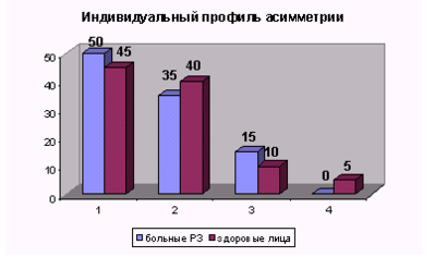 В ходе исследования были выделены следующие индивидуальные профили асимметрии у здоровых и больных лиц.