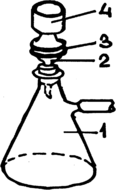 В колбу Бунзена (1) вставляют на резиновой пробке кольцевую подложку для фильтра (2) из нержавеющей стали в виде решетки с кольцевым шлифованным фланцем. На нее кладут фильтр (3), а на фильтр ставят резервуар (4), выточенный из такой же стали и тоже со шлифованным фланцем. Фланцы сжимают пружинными зажимами (не показаны). Такая легко разборная конструкция удобна для манипуляций с фильтром.