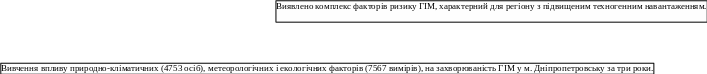 Вивчено вплив концентрації атмосферного повітря (сірководень, фенол, окис азоту) в м. Дніпропетровську на захворюваність на ГІМ. Виявлено прямий кореляційний зв'язок середньої сили між показником захворюваності на ГІМ і концентрацією сірководню (r = 0,42), що свідчить про наявність впливу цього забруднювача на захворюваність на ГІМ, який викликає тканинну гіпоксію.