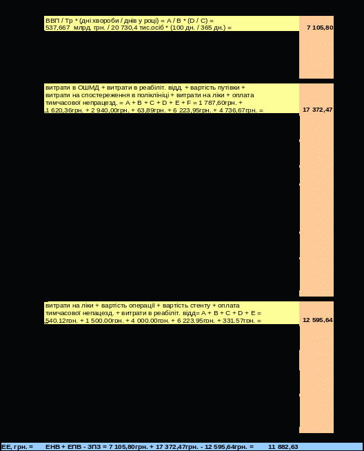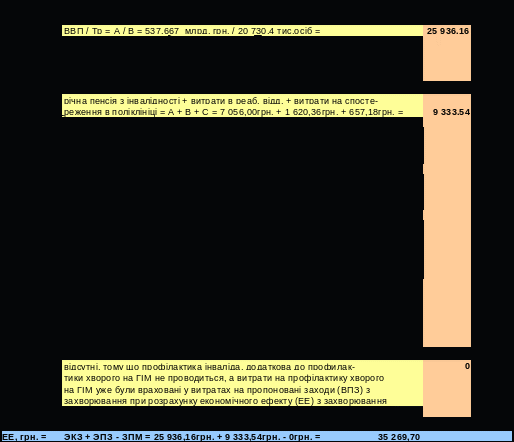 Розраховано економічний ефект запропонованих профілактичних заходів, який від попередження рівня захворюванності інфарктом міокарду на 1 %, складає 11 882,63 грн., одного випадку інвалідності 35 269,70 грн і збільшується пропорційно збільшенню обсягу проведених заходів на рівні популяції до 7 242 927,17 грн.