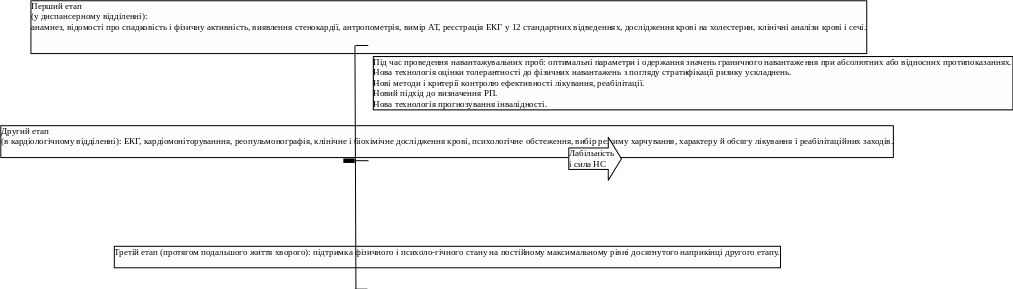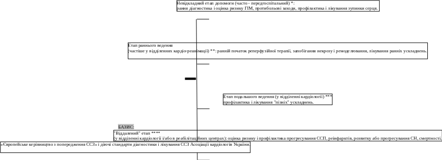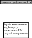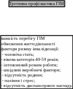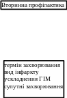 Система вторинної і третинної профілактики гострого інфаркту міокарда заснована на нових методах контролю єфективності реабілітації та прогнозу інвалідності, враховує термін захворювання, вид інфаркту, ускладнення, що супроводжують захворювання, обмеження життєдіяльності і психофізіологічний статус.
