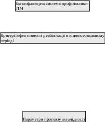In the dissertation a complex approach to forming of system of primary, secondary, tertiary prophylaxis measures of an acute myocardial infarction is realized, economically effective “Multifactor system of rehabilitation, prognosis and disability and a complex prophylaxis of myocardial infarction”, based on summarizing of investigation results of a clinical course of acute myocardial infarction, natural-climatic, biologic, social factors, of a region ecology and specific features of mode of life of the population is worked out. System of secondary and tertiary prophylaxis of an acute myocardial infarction takes into consideration term of the disease, type of infarction, complications which follow the disease, limitations of vital activity and psychic-physiologic status. “Multifactor system of rehabilitation, prognosis of disability and a complex prophylaxis of myocardial infarction” may be in the basis of prophylactic complexes in various regions of Ukraine, including regions with the increased technogenic loading.