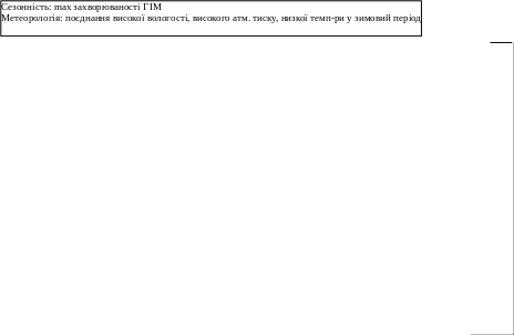 Встановлено вплив на захворюваність на ГІМ таких метеорологічних факторів, як температура, вологість повітря й атмосферний тиск. Протягом досліджуваного періоду спостерігалися: достовірний (p<0,05) зворотній кореляційний зв'язок середньої сили між температурою повітря і захворюваністю на ГІМ (r =-0,497), тобто зниження температури повітря в зимові місяці супроводжувалося ростом захворюваності на ГІМ; достовірний (p<0,05) середньо-слабкий прямий кореляційний зв'язок (r = 0,31) між захворюваністю на ГІМ і вологістю повітря, а також достовірний (p<0,05) середній прямий зв'язок (r = 0,423) між захворюваністю на ГІМ і динамікою атмосферного тиску в осінньо-зимовий період.