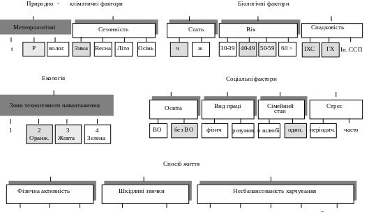 Виявлено вплив біологічних факторів на захворюваність на ГІМ – установлено достовірний (p<0,0001; F=155,5; Fкр=2,58) зв'язок між кількістю випадків ГІМ і віком. Співвідношення серед чоловіків і жінок у залежності від віку: до 39 років 10:1; 40-49 років 6:1; 50-59 років 3:1; понад 60 - 1:1 відповідно.