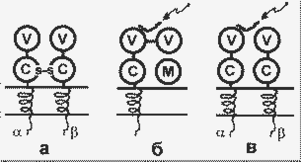 Т-рецепторы имеются на поверхности Т-лимфоцитов, а белки ГКГ - на поверхности практически всех клеток. Т-рецепторы представляют собой гетеродимеры , содержащие межцепочечную дисульфидную связь. Каждая цепь содержит глобулярные вариабильный и константный домены, экспонированные на наружной поверхности мембраны, а также трансмембранный домен и короткий цитоплазматический домен: