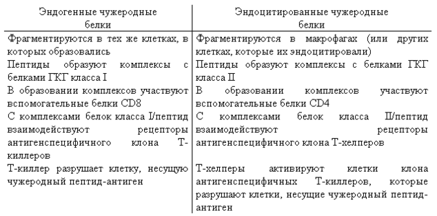 Чужеродные белки могут появиться в клетке двумя путями: 1) образоваться в самой клетке (вирусные белки, мутантные белки); 2) проникнуть путем эндоцитоза в клетки макрофагов и некоторых других фагоцитирующих клеток (любые белки, появляющиеся в жидкостях организма). Ответ клеточного иммунитета в этих случаях будет несколько различным (табл. 2).