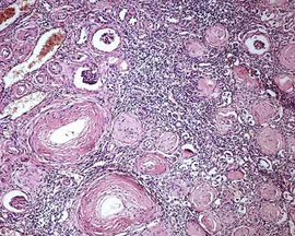 Повторяющиеся с нарастающей частотой спазмы артериол, усиливающаяся плазморрагия и возрастающее количество преципитированных белковых масс в их стенках приводят к гиалинозу или артериолосклерозу. Стенки артериол уплотняются, теряют эластичность, значительно увеличивается их толщина и соответственно уменьшается просвет сосудов (см.1)