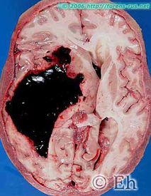 Мозговая форма – одна из наиболее частых форм гипертонической болезни. Обычно она связана с разрывом гиалинизированного сосуда и развитием массивного кровоизлияния в мозг (геморрагический инсульт) по типу гематомы (см.рис 2).