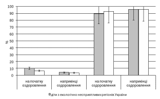 Стан здоров'я дітей на момент початку оздоровчої зміни відрізняється помірним зниженням адаптаційних резервів, більш вираженим у дітей, що постійно проживають в екологічно несприятливих умовах. Зміни адаптаційних здатностей проявляються у них збільшенням індексу функціональних змін до 2,6±0,3, показника якості реакції до 1,2±0,1, зменшенням значень індексу бактерицидності шкірних покровів до 52-64%, у порівнянні з відповідними значеннями у дітей з екологічно сприятливих місцевостей (2,50,2; 1,00,1 та 72,42,9%)