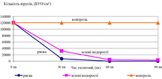 | № з/п | Назва рослин | Вихідний індекс вірусів у воді, (БУО/дм3) | Залишкова інфекційність вірусів у воді, (БУО/дм3) | Ефективність інактивації вірусів, % |