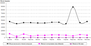 Рис. 2. Динаміка очищення стічних вод за колі-індексом в очисних каналізаційних спорудах Криворізького гірничо-збагачувального комбінату окислених руд м. Долинська Кіровоградської обл. за усередненими щомісячними даними.