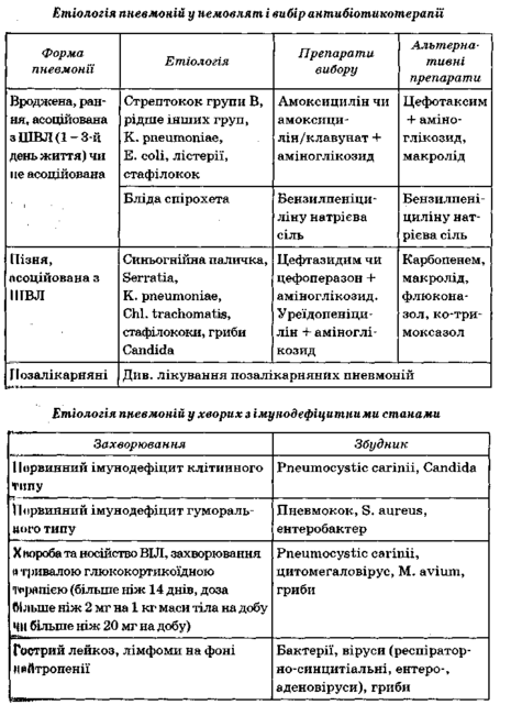 У лікуванні хворих на пневмонії бактеріальної природи використовують цефалоспорини III—IV поколінь або ванкоміцин у поєднанні з аміноглікозидами (нетиміцин, амікацин). При пневмоцистній етіології — котримоксазол у великих дозах. При грибковій інфекції — протигрибкові препарати (флюконазол, амфотерицин В). При вірусних пневмоніях антибіотикотерапія неефективна, на перший план виступає посиндромне лікування. У разі тяжкого перебігу грипозної пневмонії доцільним є внутрішньом'язове введення протигрипозного гаммаглобуліну № 3—4 з інтервалом 1—2 дні, інтерферону у віковій дозі, при цитомегаловірусній інфекції — введення ганцикловіру. Тривалість терапії становить не менше ніж 3 тиж, при протозойній і грибковій пневмоніях — 4—6 тиж і більше.