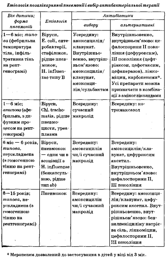 Оптимальна тривалість терапії при всіх формах гострої пневмонії повинна бути достатньою для пригнічення життєдіяльності збудника, елімінацію якого завершують імунологічні механізми. При адек ватному виборі антибіотика і швидкому настанні ефекту буває достатньо 6—8 днів терапії. Про повний ефект ми говоримо, якщо зниження температури тіла нижче ніж 38 °С відбулося через 24—48 год при неускладненій і через 3—4 доби при ускладненій пневмонії. Частко вий ефект — це збереження фебрильної температури тіла після закін чення зазначених термінів при зниженні ступеня токсикозу, задиш ки, поліпшенні апетиту, відсутність негативної рентгенологічної ди наміки. При неускладнених пневмоніях краще використовувати оральні засоби. Якщо терапія була почата з парентерального введен ня ліків, після досягнення клінічного ефекту варто перейти на оральні препарати (ступеневий метод). Профілактичне призначення проти грибкових препаратів не виправдане.