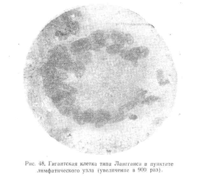 Гигантские многоядерные клетки (рис. 48) характеризуются огромными размерами. Они достигают 30—70 μ, имеют овальную, реже круглую форму и содержат большое число ядер. Ядра имеют одинаковый размер и группируются главным образом по периферии клетки. Хроматин ядер располагается равномерно, в виде нежной ажурной сетки и содержит единичные ядрышки. Протоплазма обильна, нежноголубая. Наличие в мазках одного из этих компонентов туберкулезной грануломы является достаточным для диагносцирования туберкулезного процесса.