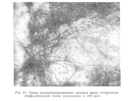 Пятый вид пунктата наблюдается при фиброзной форме туберкулезного лимфаденита. Характерным для него является, наряду с гиперпланзией лимфаденоидной ткани, наличие грубых пучков соединительнотканных волокон. По периферии последних иногда располагаются эпителиоидные клетки и гигантские клетки (рис. 51).