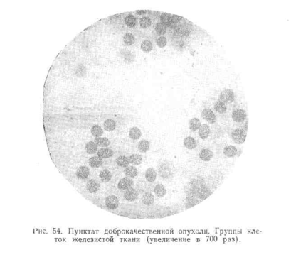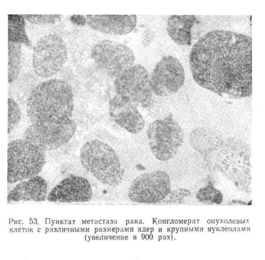 В пунктатах метастазов злокачественных опухолей в лимфатические узлы при микроскопическом исследовании отмечается отсутствие элементов нормальной лимфаденоидной ткани. Препарат содержит крупные конгломераты атипичных клеток, имеющих очень своеобразную морфологию (рис. 53). Характерными для них являются: а) разнообразие форм и размеров клеток; б) большое ядерно-протоплазменное соотношение; в) наличие крупных нуклеол, часто множественных; г) неравномерность окраски клеток; д) резко выраженная базофилия протоплазмы; последняя большей частью имеет вид общего синцития; е) наличие гигантских клеток уродливой формы и асимметрических митозов.