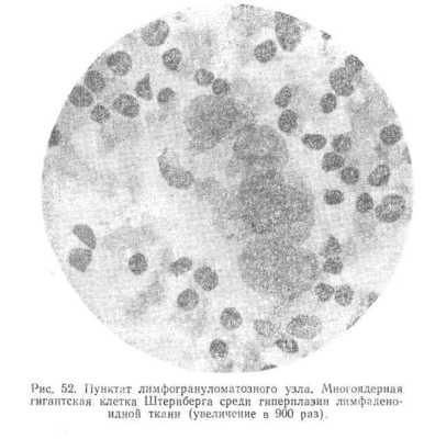 Характерным морфологическим признаком пунктатов лимфогрануломатозных узлов является картина резко выраженного клеточного полиморфизма. В этих случаях в препаратах отмечается преобладание уродливых лимфоидно-ретикулярных клеток, отличающихся многообразием своих форм. Среди них наблюдаются нейтрофилы, эозинофилы, плазмоциты, небольшое количество лимфоцитов, гипертрофированные ретикуло-эндотелиальные клетки и гигантские клетки Штернберга. Морфологически клетки Штернберга (рис. 52) представляют собой крупные образования. Они имеют большей частью неправильную округлую, реже удлиненную форму с неровными зубчатыми контурами и содержат .множество крупных и мелких ядер, чаще всего беспорядочно, расположенных. От ядер гигантских клеток они отличаются грубой зернистой структурой хроматина ядра, размерами и наличием огромных нуклеол, которые обычно свойственны клеткам злокачественной бластомы.