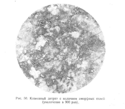 Казеозный детрит располагается в мазках в виде мельчайших крупинок или в форме неправильных глыб. Нередко в этом аморфном детрите содержится большое количество аморфных солей и кристаллов холестерина (рис. 50), указывающих на процесс обызвествления туберкулезного очага. Среди казеозных масс могут находиться также эпителиоидные й гигантские клетки. Наряду с богатыми казеозным детритом пунктатами, наблюдаются пунктаты, лишь с небольшими участками казеоза среди выраженной гиперплазии лимф аденоидной ткани. Этих небольших участков бывает вполне достаточно для постановки диагноза туберкулезного лимфаденита, так как морфология их очень характерна.