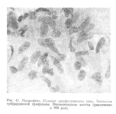 Таким образом, присутствие специфических элементов туберкулезной грануломы дает возможность простым методом пункции без применения биопсии диагноецировать туберкулезный лимфаденит в различных стадиях его развития.