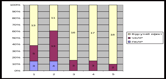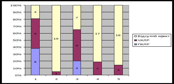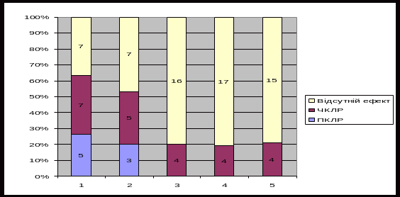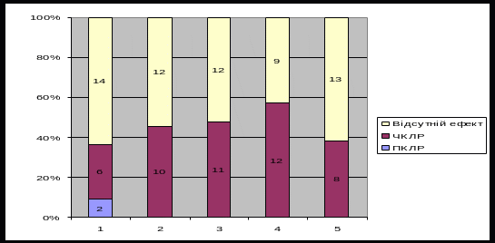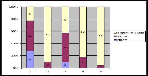 Хворим, яким було застосовано поєднаний метод імунотерапії (П+ЦФ) відреагували на дану імунотерапію подібно, але кращі результати відзначалися у пацієнтів з проліферативними морфологічними формами ХГН, особливо в групі хворих з МезПГН (ПКЛР+ЧКЛР становило більш як 60%). У хворих з МПГН (більш, як 50% ПКЛР+ЧКЛР). На дану терапію хворі з непроліферативними морфологічними формами ХГН відреагували таким чином: МЗ(18% ЧКЛР), МН (19% ЧКЛР), ФСГС (18,2% ЧКЛР), а ПКЛР не спостерігалося у цих пацієнтів(рис. 3).