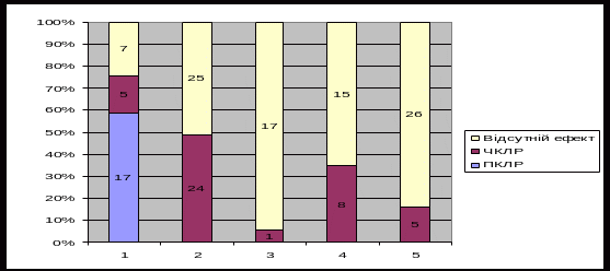У пацієнтів, яким було застосовано комбіноване застосування циклоспорину та преднізолону кількість випадків ПКЛР збільшилася у хворих з МЗ та у хворих з МН. У пацієнтів з проліферативними морфологічними формами ХГН результати були подібними до попередніх (рис. 5).