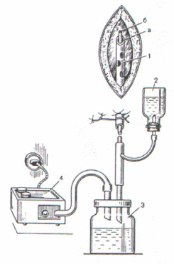 Разрежение в системе может быть создано с помощью шприца Жене, которым удаляют воздух из герметичной банки с подключенным к ней дренажем либо с помощью водоструйного отсоса, или трех баночной системы. Это наиболее эффективный метод, он способствует уменьшению полости раны, более быстрому ее закрытию и ликвидации воспаления.