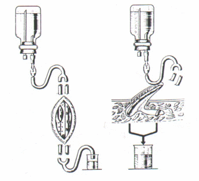 При проточно-промывном дренировании в рану устанавливается не более 2-х дренажей. По одному (или нескольким) из них постоянно в течении суток осуществляется введение жидкости (лучше антисептический раствор), а по другому она вытекает. Введение веществ в дренаж осуществляется на подобии внутривенных капельных вливаний. Способ эффективен и позволяет в ряде случаев зашивать наглухо даже инфицированные раны, что в последствии ускоряет процесс заживления (через 5-7 дней промывания число микроорганизмов в 1мл отделяемого всегда становится ниже критического; через 10-12 дней более чем в половине случаев раны становятся стерильными) (рис. 4).