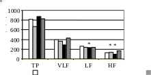Рис. 3. Динаміка змін спектральних показників варіабельності серцевого ритму в хворих на виразкову хворобу дванадцятипалої кишки, асоційовану з Н. рylori, загальна спектральна потужність яких в лежачому положенні перевищувала 1500 мс2 (підгрупа В); фонова (а) та ортостатична проби (б)