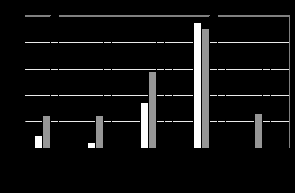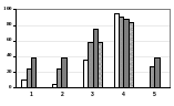 Рис. 1. Динаміка вмісту 4-гідроксиноненалю у структурах слизової оболонки антрального відділу (а) та тіла (б) шлунка (1 – поверхневий епітелій, 2 – фовеолярний епітелій, 3 – власна пластинка, 4 – цитоплазма гландулоцитів, 5 – ядро гландулоцитів)