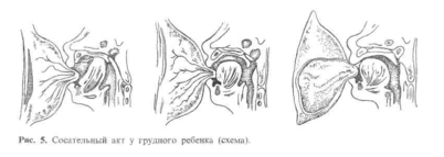 Новорожденный имеет хорошо выраженные сосательный и глотательный рефлекс ы. Если ребенок здоров, через 6—12 ч после рождения его можно приложить к груди матери. Акту сосания содействуют особые валикообразные утолщения во рту — альвеолярные возвышения, расположенные на альвеолярных отростках, поперечная исчерченность на слизистой оболочке губ, а также жировые комочки в толще щеки (комочки Биша). Самый акт сосания состоит из трех фаз (рис. 5): аспирации (а), сдавливания соска (б) и проглатывания аспирированного молока (в). Приложенный к груди матери ребенок плотно охватывает губами сосок и часть околососкового кружка, сообщение между полостью рта и наружным воздухом прекращается. Язык ребенка прижимается к небу, нижняя челюсть опускается, во рту создается отрицательное давление. В разреженное пространство полости рта поступает грудное молоко, которое ребенок проглатывает.