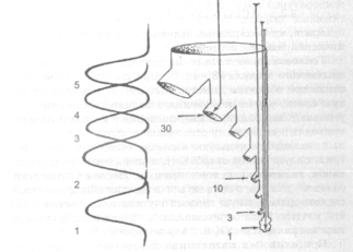 Рис.2 Масс-медиальные размеры частиц аэрозоля, генерирующих при различных видах ингаляций, и область их эффективного воздействия. 1 - ультразвуковые ингаляции, 2 - воздушные и масляные, 3 - влажные и тепловлажные, 4 - паровые, 5 - ингаляции порошков. Цифры справа - линейные размеры генерируемых частиц аэрозоля.
