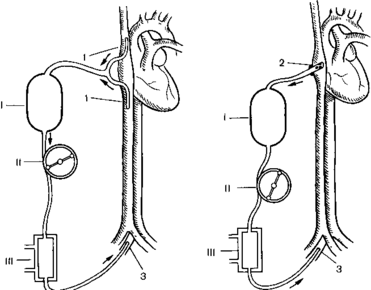 Рис. 4. Схема общей гипотермической перфузии с канюляциеи полых вен (а) и правого предсердия (б) I — оксигенатор II наеое 111 тыообхк нник 1 — почые вены 2 правое предсердие } бедренная артерия