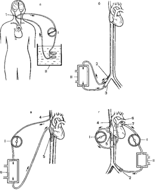 Пионером разработки и клинического применения метода является D. Ross (1954). Верхнюю и нижнюю полые пены канюлируют через ушко правого предсердия. С помощью роликовою насоса кровь из верхней полой вены нагнетается через теплообменник в нижнюю полую вену. (рис 3, в) По сравнению с артериовенозным охлаждением методика имеет дополнительные преимущества в виде возможности контроля минутного объема сердца с помощью роликового насоса и применения гипотермии только после торакотомии и уточнения диагноза. Основными недостатками методики являются возникновение фибрилляции желудочков сердца в связи с быстрым снижением температуры крови, гемолиз, возможность тромбообразования. В рассмотренном варианте в настоящее время метод в клинике не применяется. Общее глубокое охлаждение по Дрю. Методика разработана и внедрена в клиническую практику С. Drew и J Anderson в 1959 г. Канюли вводят в полые вены, легочную артерию, левое предсердие и бедренную артерию (рис. 3, г) Венозная кровь из полых вен поступает в наполнительный сосуд и оттуда насосом перекачивается в легочную артерию. Далее оксигенированная в легких кровь через катетер, введенный в левое предсердие, поступает в другой наполнительный сосуд и оттуда вторым роликовым насосом нагнетается в бедренную артерию. Таким образом, вместо оксигенатора используются легкие больного. Другими особенностями методики являются глубокое охлаждение — до 10—15 °С в пищеводе и полное прекращение кровообращения (до 50—60 мин). По мнению авторов, методика обеспечивает комфорт для хирурга (истинно «сухое» операционное поле). Меньше травмируются форменные элементы крови, меньше требуется донорской крови. Отметим также, что эта методика позволяет оперировать по поводу порока, коррекция которого требует прекращения кровообращения. Недостатков у методики немало: множественная канюляция, трудности, связанные с малым диаметром сосудов у маленьких детей и при таком пороке, как тетрада Фалло, когда наблюдается сужение (вплоть до атрезии) легочной артерии. Серьезным недостатком является отсутствие возможности вскрытия предсердий, так как последние являются коллекторами замкнутой системы. Это существенно осложняет выполнение простых непродолжительных (15—20 мин) операций, когда нет необходимости в глубокой гипотермии и тем более в прекращении кровообращения В 60-х годах, кроме авторов, методику использовали в клинике Т. Shield и F. Lewis (1959), A. Gordon и соавт. (1960). В настоящее время эта методика практически не применяется.