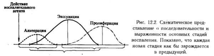 Такое деление сохраняется и в настоящее время. Однако новые исследования и новые факты показали, что указанные стадии не монолитны, между ними нет четких границ (например, альтерация может быть максимально выражена на стадии гнойной экссудации, а нарушения микроциркуляции могут быть неодинаковыми в одно и то же время в различных участках очага воспаления). Поэтому в зависимости от процесса, преобладающего на определенном этапе воспаления, выделяют следующие стадии (рис.):