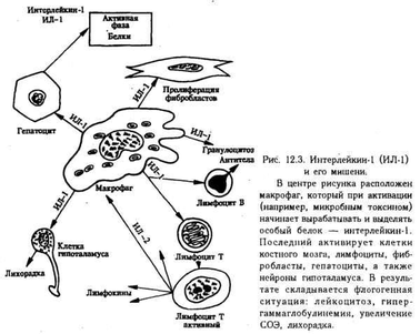 Есть основание предполагать, что характерные для ранних этапов заболевания симптомы (головная боль, боль в мышцах и суставах, сонливость, лихорадка, лейкоцитоз и увеличение содержания белков, в том числе иммуноглобулинов) объясняется именно действием ИЛ-1 (рис.).